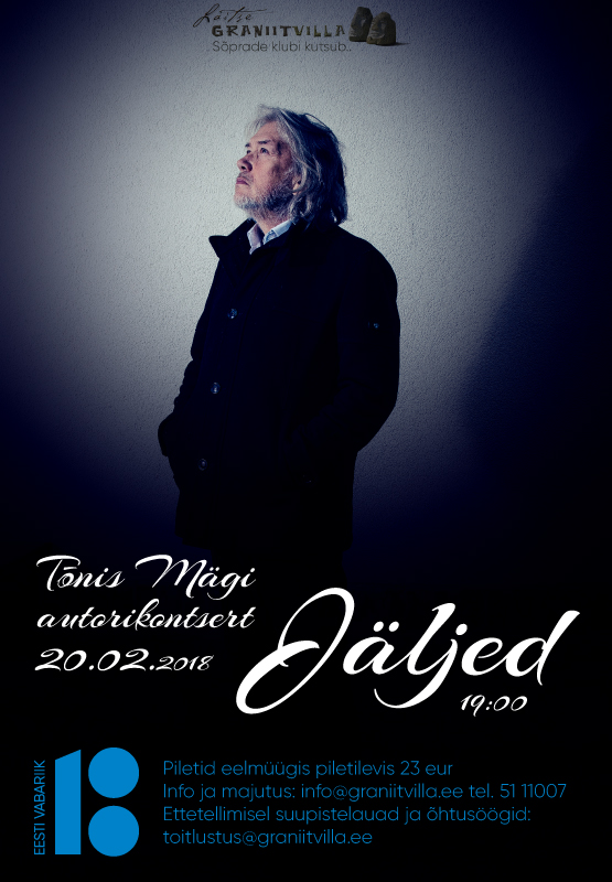 End eestlaste südamesse laulnud laulja ja helilooja Tõnis Mägi annab Laitse Graniitvillas autorikontserdi pealkirjaga „jäljed”. See on laulude õhtu, mille jooksul saab kuulaja nautida muusiku tuntuid ja vähemtuntuid laule ning kuulata autorilt endalt laulude sündimise lugusid ja mälestusi tema erakordselt värvikast elust, mis ei jäta külmaks ühtki kaasaelajat.Tõnis Mägi on muusik, kes ei vaja Eestis tutvustamist. Aastakümneid lavalaudadel musitseerinud artisti loomingusse kuulub sadu rahva poolt armastatuid laule, nende seas ka „Koit”, mis valiti 2004. aastal eestlaste lemmiklauluks.